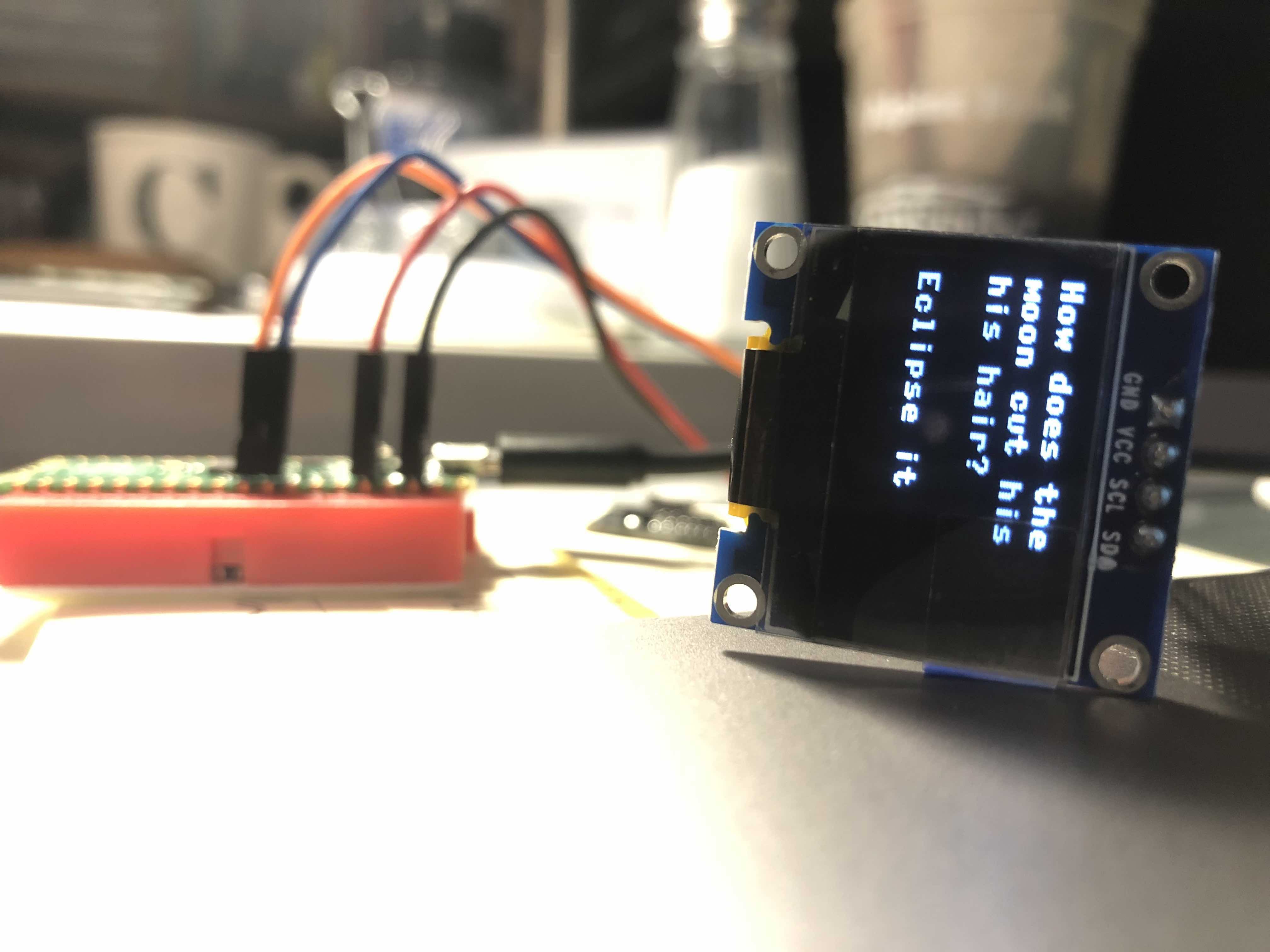 I learned how to print a short message to a common SSD1306 LCD screen (and of course tested it with a non-proofread dad joke). I'll likely make a digital magic 8 ball or pocket dad joke generator at some point to continue learning about these amazing little devices so I can use them on future, more complicated projects benefiting from a display.